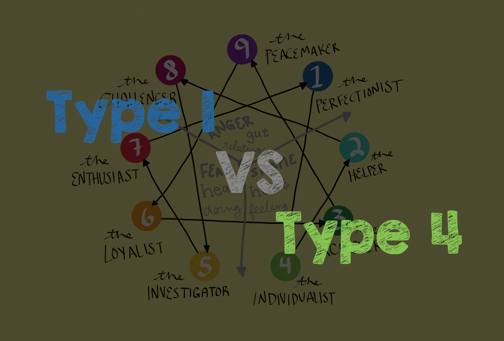 嚴肅而務實的 1 號可能會抵制 4 號強烈的情感,因為他們覺得這是自我放縱。1 號告訴自己“把心收回來,還有工作要做呢。” 1 號認為 4 號是瘋狂流露情感的人,認為 4 號想借此與眾不同,他們的行為應該受到一定規則的約束。1 號的批評會加深4 號的自卑。為了報復,他們也會直接指出 1 號的問題:“你沒有感情,” “你太冷酷!”“你無動於衷!”這些話的潛臺詞是: 4 號情深意重,因此比別人都好。這種互相攻擊的惡性循環也有辦法可以化解。4 號應該去瞭解 1 號為什麼要控制“負面”情緒,而 1 號需要感受到深層情感的聯繫和融合。心靈的世界是外在規則無法控制的。